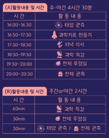 - 주제 : 태양과 태양계 행성들 (낮) / 빅뱅과 우주 (저녁)