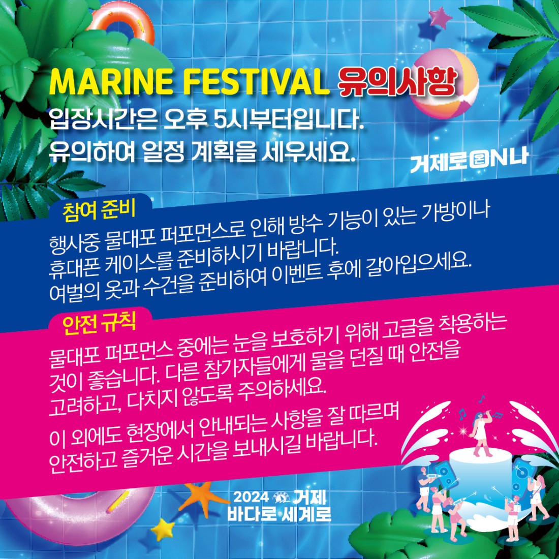메인공연으로 Sea Bomb 페스티벌과 거제 블루 플로깅 등 ESG 캠페인도 진행됩니다.